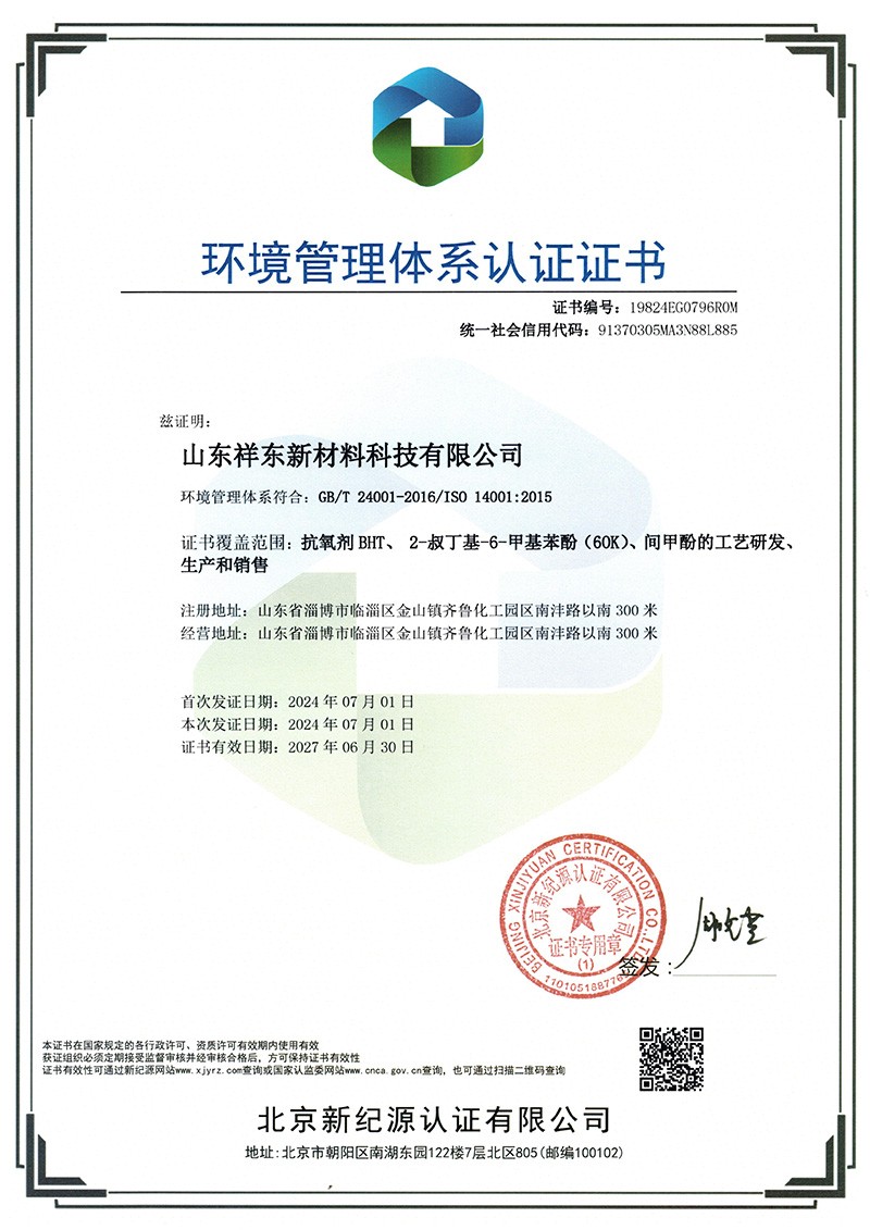 山東祥東新材料科技有限公司1.2萬(wàn)噸/年6-叔丁基鄰甲(60K)、4-叔丁基鄰甲酚(偏 24 酚)和 4,6-二叔丁基鄰甲酚(偏 246 酚)烷基甲酚項(xiàng)目竣工環(huán)境保護(hù)驗(yàn)收監(jiān)測(cè)報(bào)告